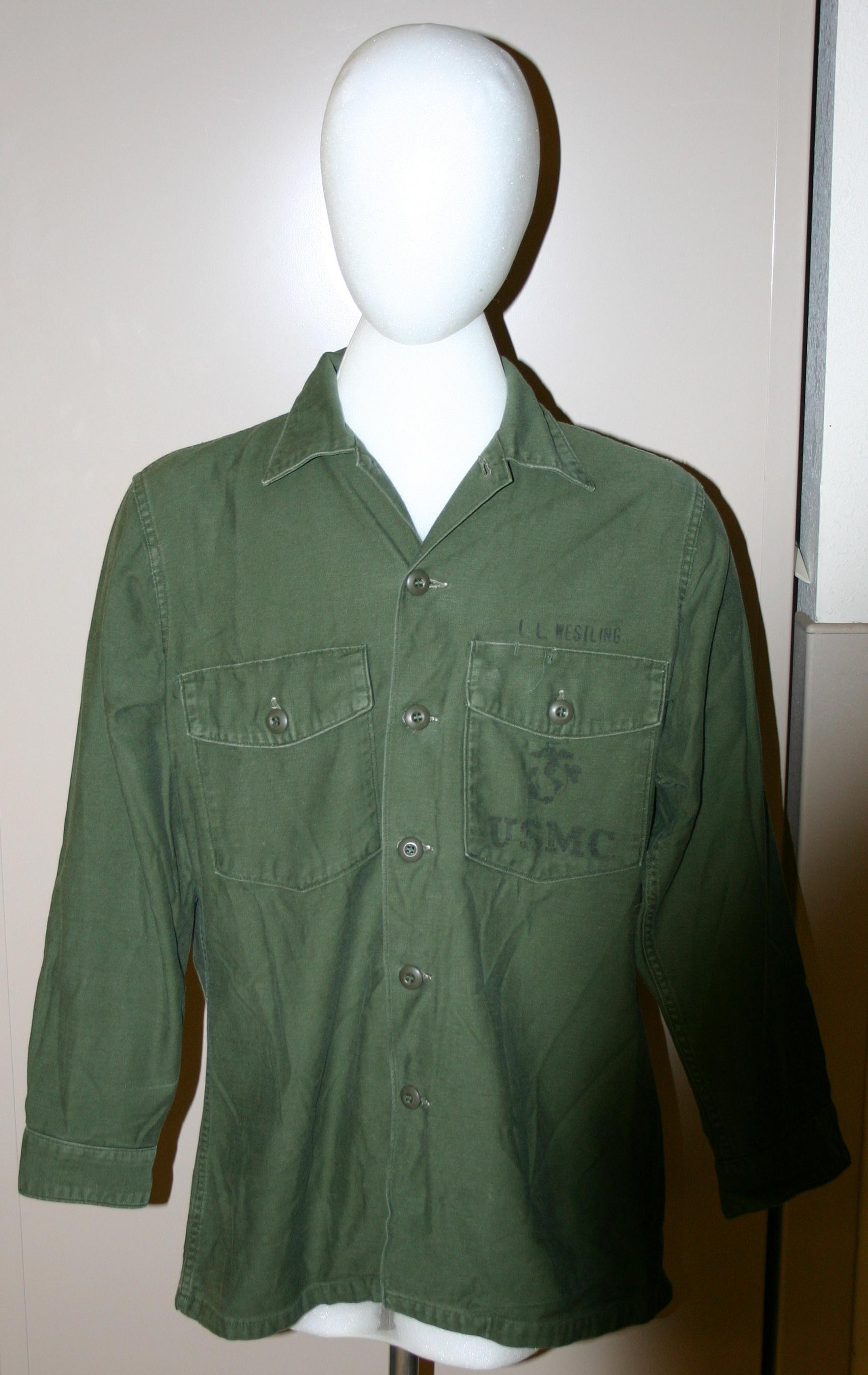 U.S. Marine Corps long sleeve olive drab uniform shirt. USMC and logo printed on left breast pocket, L.L. Westling printed above pocket.