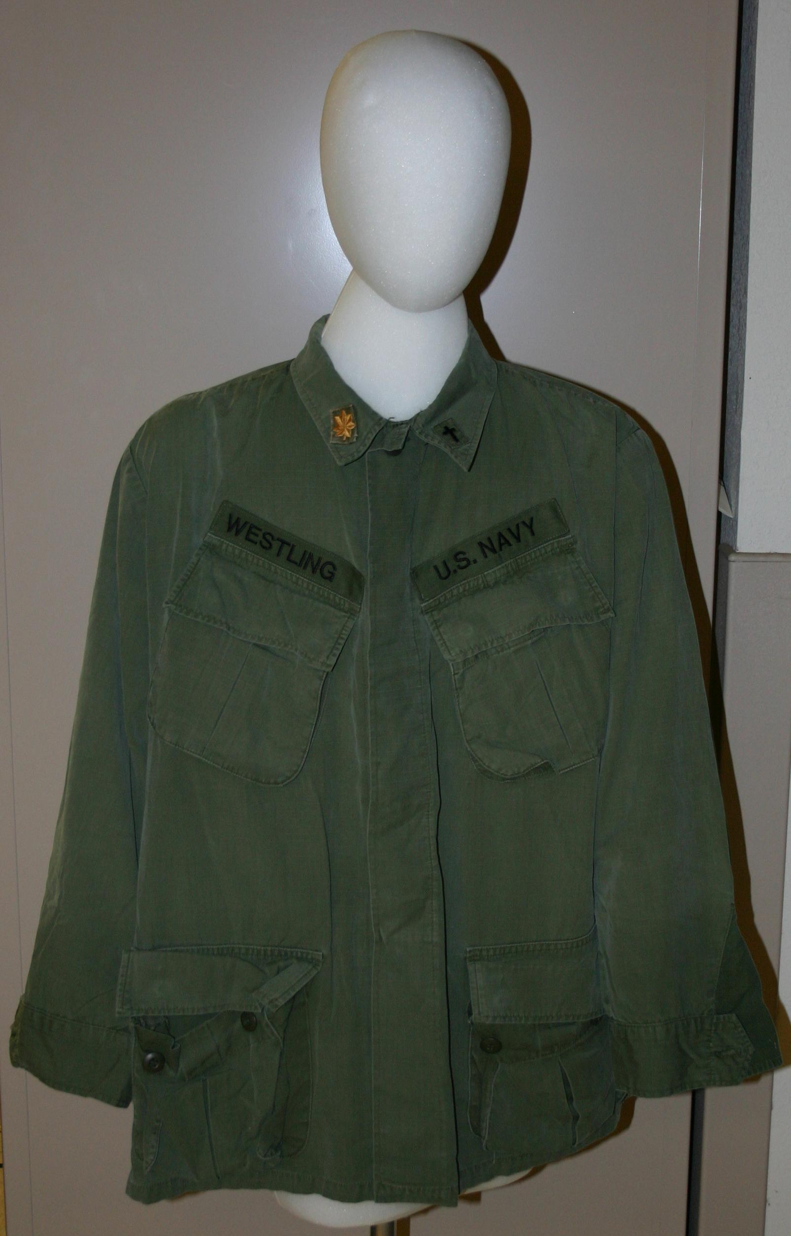 U.S. Navy long sleeve olive drab uniform shirt. U.S. Navy embroidered on tag sewn above left breast pocket, Westling embroidered on tag sewn above right breast pocket. Chaplain Corp. insignia and major's insignia on collar tabs.