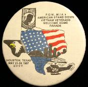 Button commemorating a P.O.W/M.I.A. Welcome Home Parade in Houston, Texas on May 21-24 1987. Within an outline of the state of Texas is a collage containing an eagle's head, a P.O.W./M.I.A. logo, stars and stripes, the Houston skyline and a helicopter.