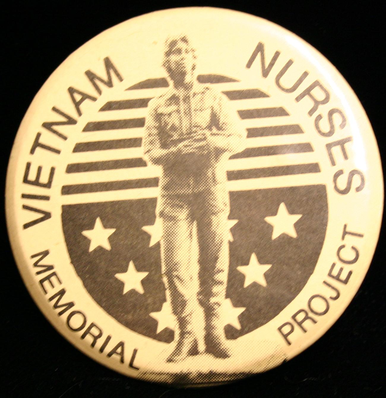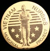 Button commemorating the Vietnam Women's Memorial Project. A photo knockout of a female soldier on a field of stars and stripes. Text surrounds the circular, black and white design. Corresponds with a matching button in the collection which has a color design.