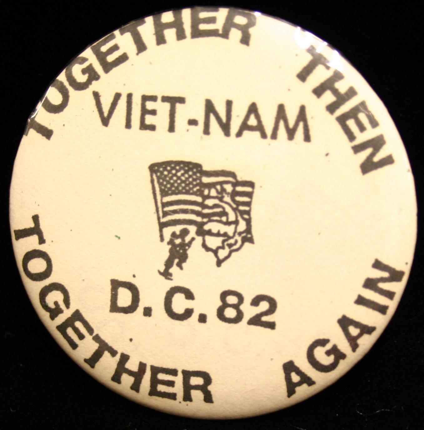 TOGETHER THEN, TOGETHER AGAIN button. White field with black text. Black and white American flag, soldier, and outline of Southeast Asia in the center of button with the text VIET-NAM and D.C. 82 above and below images.