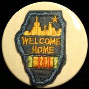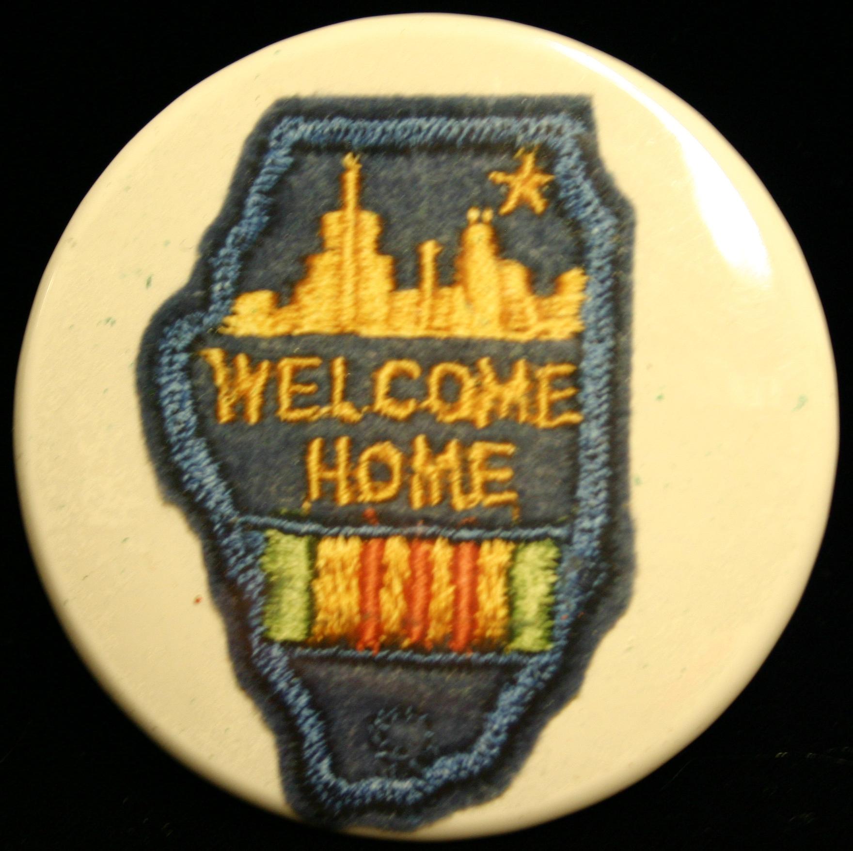 Button of a photo of a patch in the shape of the state of Illinois with the text WELCOME HOME stitched in the center below a city skyline. Corresponds with a smaller button in the collection which has the same design.
