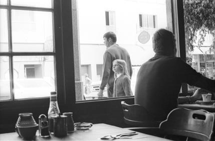 Hippies on sidewalk across from small park near ferry terminal from San Francisco
