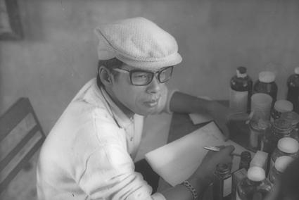 Vietnamese man with cap and bottles on desk