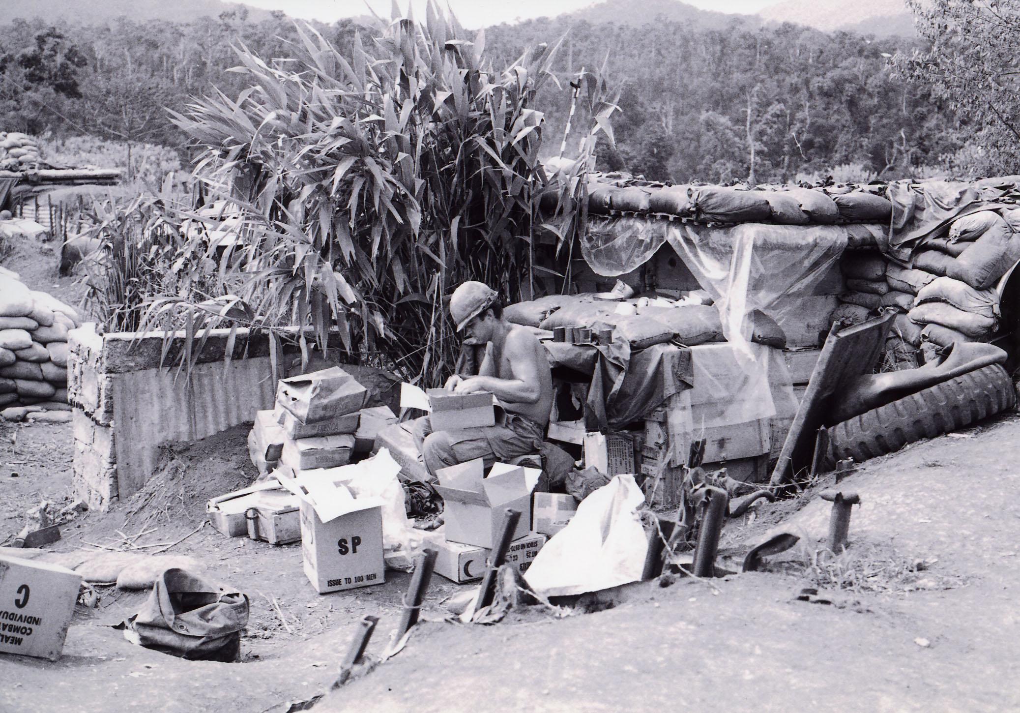 Soldier carrying supplies through a base camp.