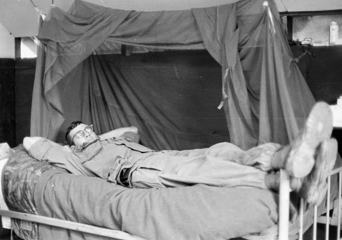 1st Lt. Paul L. Sauer, Medical Service Corps, on bed in hootch, adjacent to 1/77 Armored battalion medical aid station. Mosquito netting over bed.