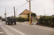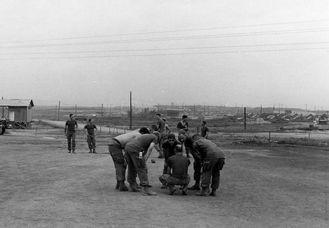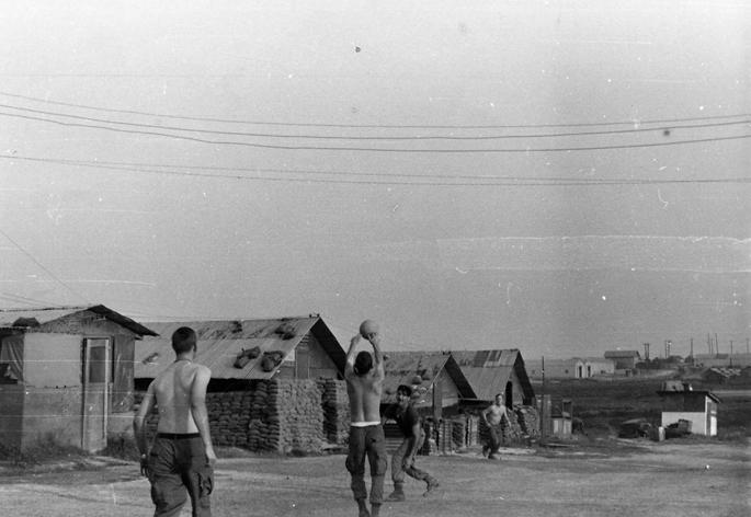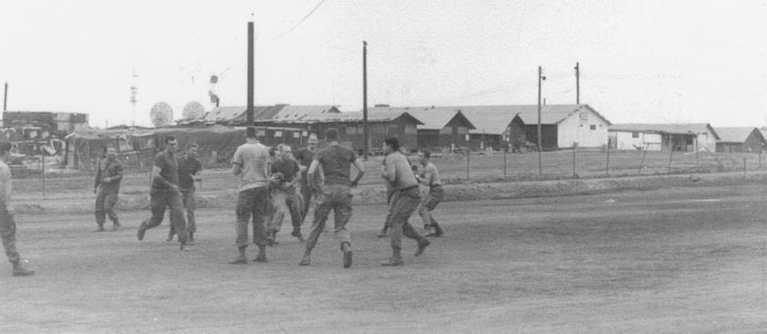 Touch football, 1/77 Armored Battalion, 1/5 Infantry Brigade (Mechanized) Quang Tri Combat Base. Quang Tri PX is building on right with white gabled front. The post barber shop was located two buildings to left of PX (note striped poles in front). Pallets of merchandise located on left behind football players.