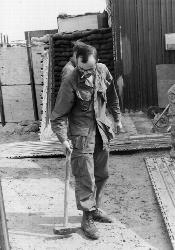 Medic, name unknown, 1/77 Armored Battalion, with hand on sandbags surrouding hootch for battalion surgeon and MSC lieutenant. Building in background on right is 1/77 Armored Battalion Officers Club. Number 613 stamped on back of original photograph.