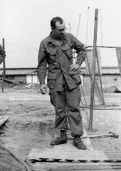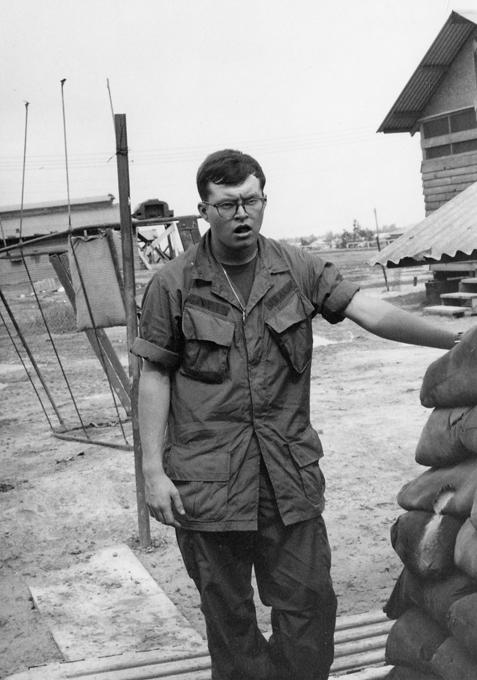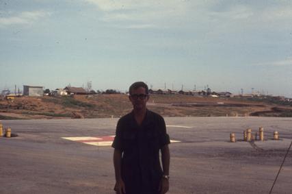 Captain James B. Evans, at Emergency Room entrance, 91st Evacuation Hospital, Chu Lai. Hospital helicopter landing pad behind Jim Evans.