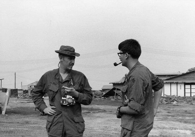 Medical Specialist Jaan Goad with camera and Medic Arrington Laughlin, outside 1/77 Armored Battalion Aid Station. Building in background on right is Special Services Club. Number 613 stamped on back of original photograph.