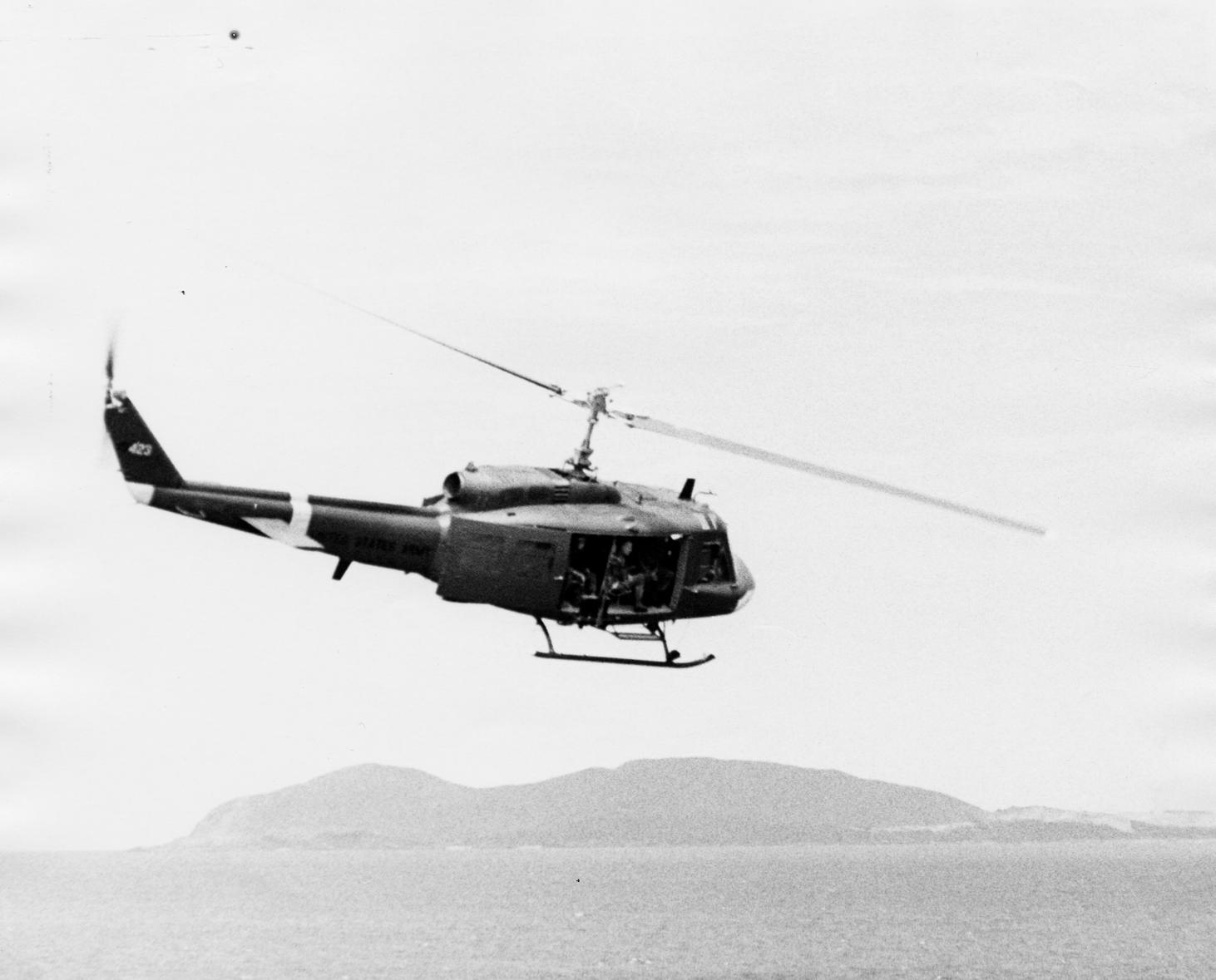 Telephoto view of helicopter over Chu Lai Bay with Batangan Peninsula in distance. From area near Officers Club, 91st Evacuation Hospital.