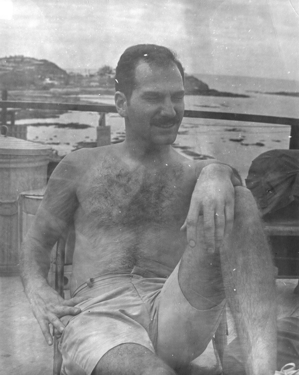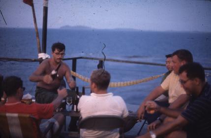 Boys Camp deck, 91st Evacuation Hospital. Left to right: Dr. Steve Vanderfliet[Hospital ophthalmologist, 1 year residency training], Dr. Delaney, center, and Dr. Nathena