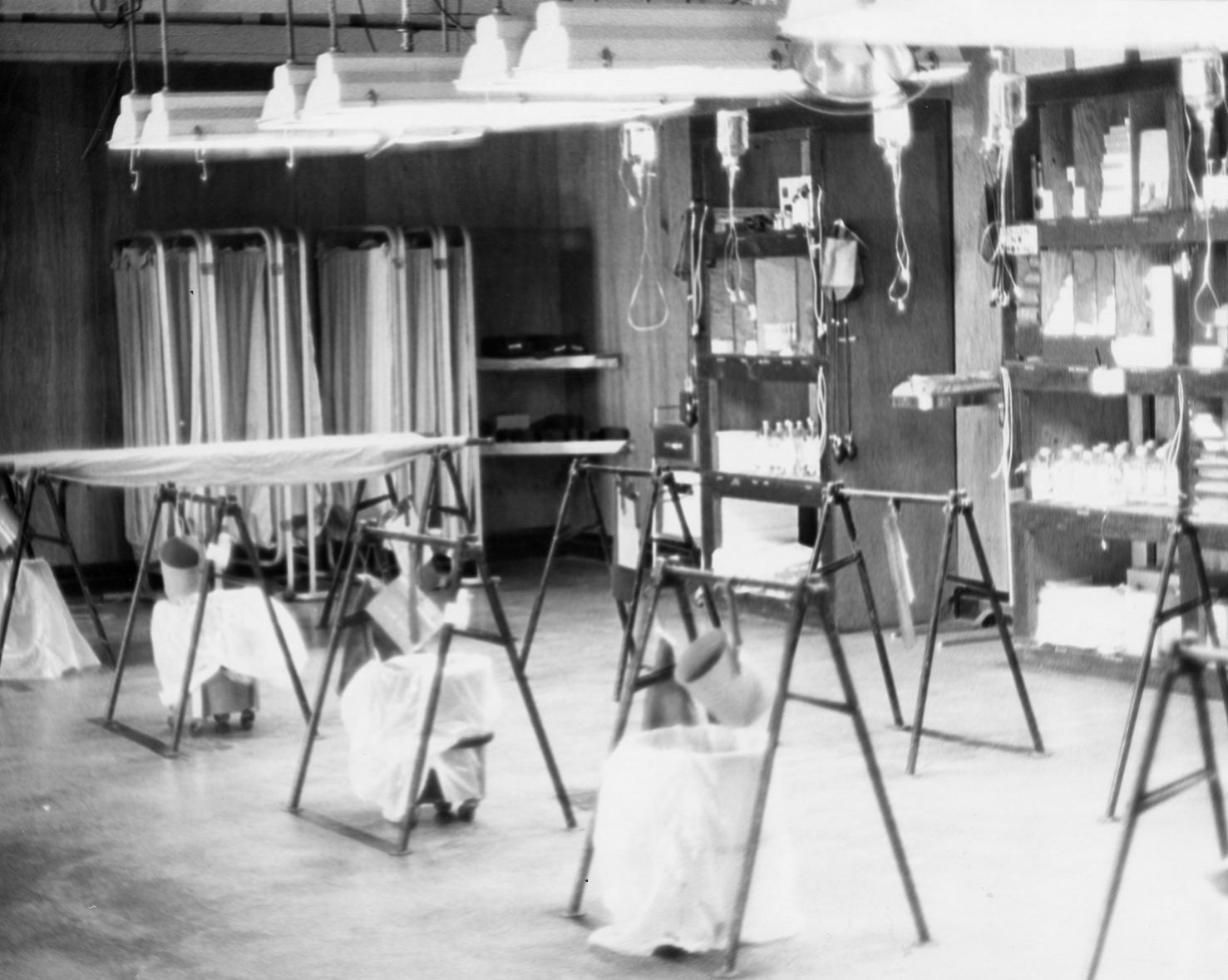 10A Interior Emergency Room, 91st Evacuation Hospital, Patients were brought in on stretchers and stretchers were then placed on sawhorses. Cloth panels at back were used to hide bodies in temporary morgue in Emergency room until Graves Registration claimed the bodies.
