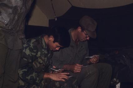 91-Charlies, Medical Specialist Mark Doom, left wearing hat, Medical Specialist Jaan Goad, right, and Medic Arrington Laughlin on left behind Mark Doom, inside 1/77 Battalion Aid Station. Two copies of original photograph, 613 and 750 stamped on back.