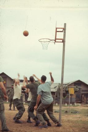 Basketball at 1/77 Armored Battalion, Quang Tri Combat Base. Man in green scrubs is 1st Lt. Paul L. Sauer, Medical Service Corps, 1/77 Armored Battalion. Building in background with red door is booth for Paul Sauer and the Battalion surgeon.