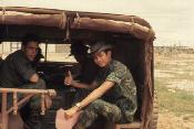 Sgt. Forte and Sgt. Danny Thieu in back of jeep, Quang Tri Combat Base. Sgt. Forte was a buck sergeant. Sgt. Thieu was scout and interpreter for 1/77 Armored Battalion.