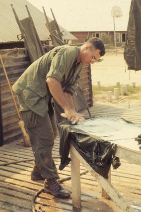 1st Lt. Paul L. Sauer, Army Medical Service Corps, 1/77 Armored Battalion, doing laundry outside battalion aid station