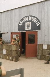 Exterior Chu Lai Airport. 'Welcome to Chu Lai' - Photographs made en route to R&R in Hong Kong. I had planned to go to Sydney but no standby seats were available. I opted to return to Hong Kong rather than waste leave time waiting in Saigon.