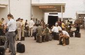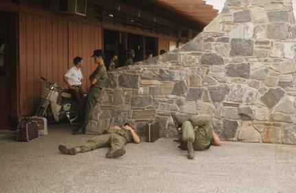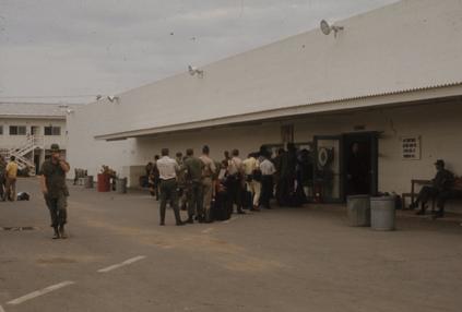 Men outside entrance to Chu Lai Airport - Photographs made en route to R&R in Hong Kong. I had planned to go to Sydney but no standby seats were available. I opted to return to Hong Kong rather than waste leave time waiting in Saigon.