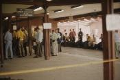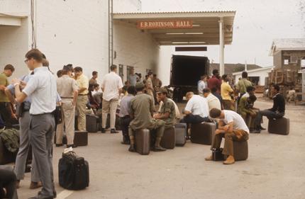 Men waiting outside Robinson Hall to go on R&R - Photographs made en route to R&R in Hong Kong. I had planned to go to Sydney but no standby seats were available. I opted to return to Hong Kong rather than waste leave time waiting in Saigon.