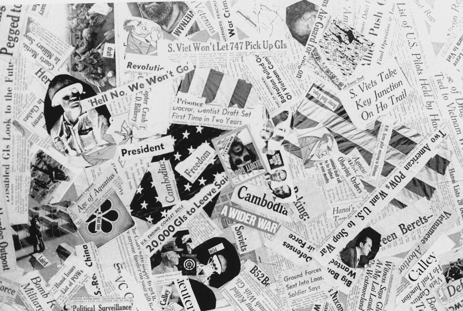 Jim B. Evans' Vietnam Collage of headlines and illustrations was glued onto masonite or pressed board measuring 24x30. Spiro Agnew as a bearded hippie is partially included on this photographic reproduction, upper center.