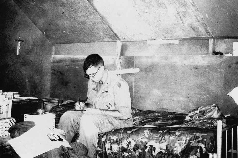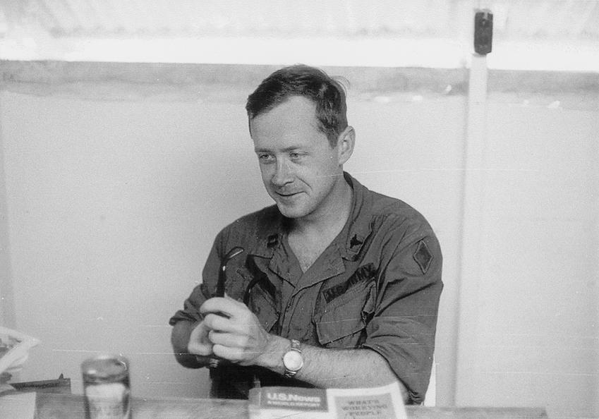 Captain James B. Evans, Army Medical Corps, battalion surgeon 1/77 Armored Battalion, 1/5 Infantry Brigade [Mechanized], battalion surgeon from November 1969 to early June 1970, at desk inside battalion aid station Quang Tri Combat Base.