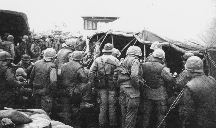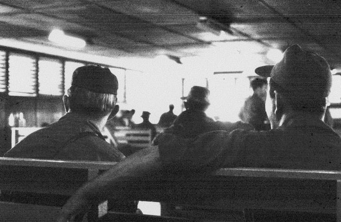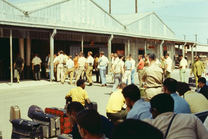 Standing in line for R&R processing, DaNang. At least we were out of those damn green fatigues. Going to Hong Kong from Quang Tri