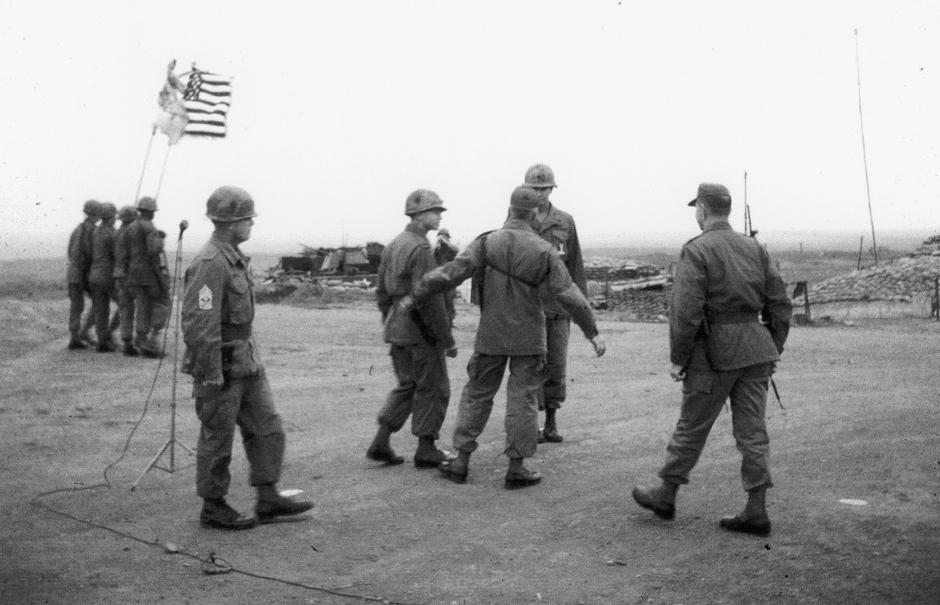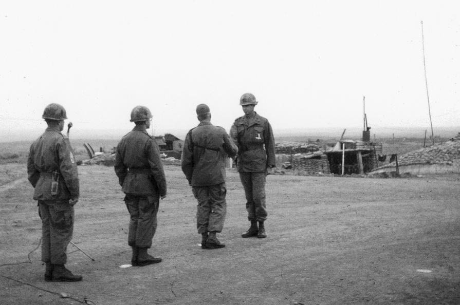 Captain James B. Evans, Army Medical Corps, battalion surgeon 1/77 Armored Battalion. Building in background is 1/77 Armored Battalion Officers Club. Panel above door was symbol for 1/77. Photographer: 1st Lt. Paul L. Sauer, Medical Service Corps