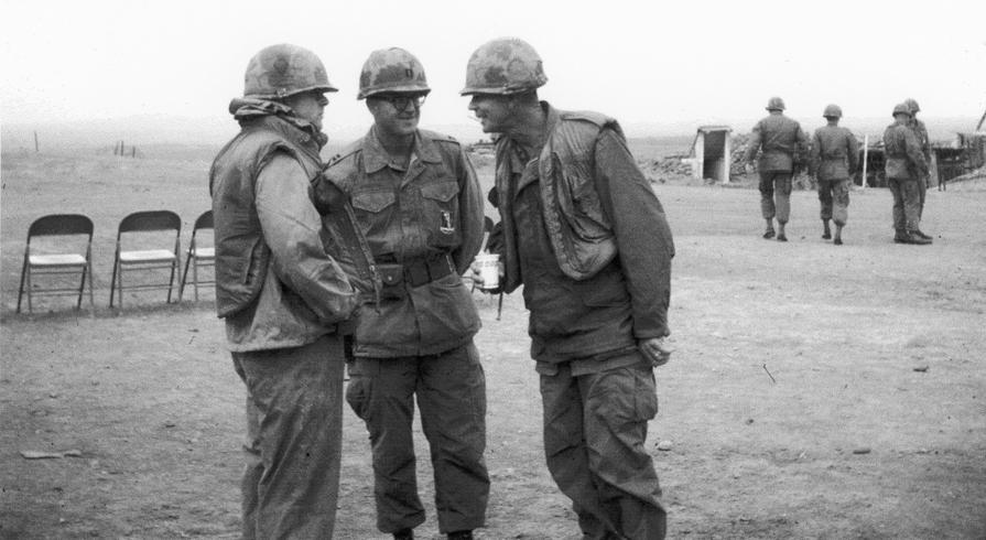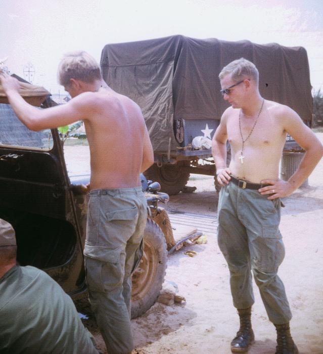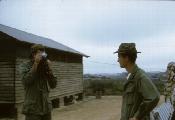 1st Lt. Paul L. Sauer, Medical Service Crops, on left with camera, and 91-C Medical specialist Mark Doom. Building in background was 1/77 Officers Club