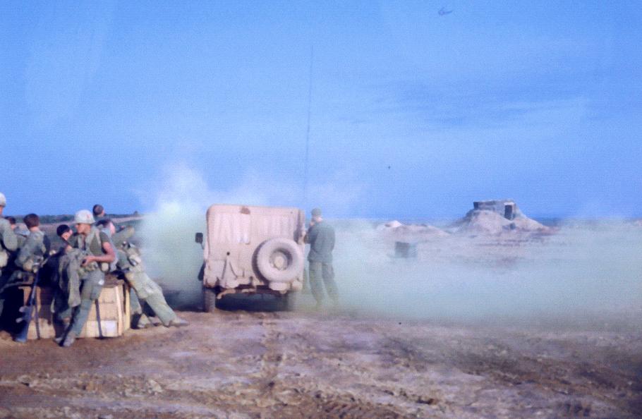 91-C medical specialist Mark Doom, 1/77 Armored Battalion, 1/5 Infantry Brigade [Mechanized], outside battalion aid station, Quang Tri Combat Base. Mark Doom got an early out about this time to attend military prep school.