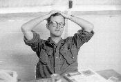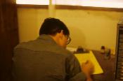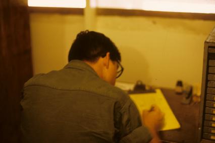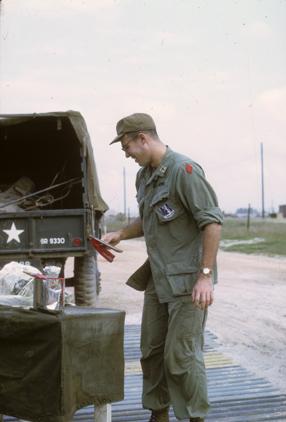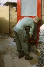 1st Lt. Paul L. Sauer outside hootch, Quang Tri Combat Base, painting stapler with red paint. He is standing on PSP panels.
