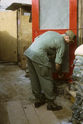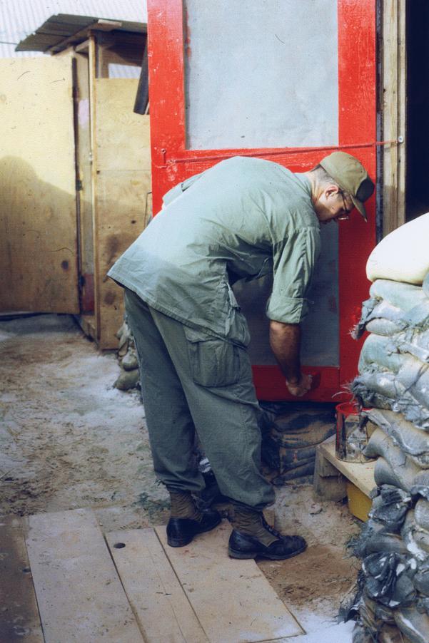 1st Lt. Paul L. Sauer, Medical Service Corps, painting hootch door of quarters for battalion surgeon and Medical Service Corps lieutenant, 1/77 Armored Battalion, Quang Tri Combat Base