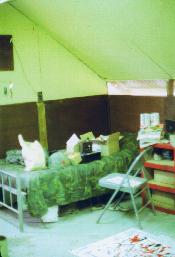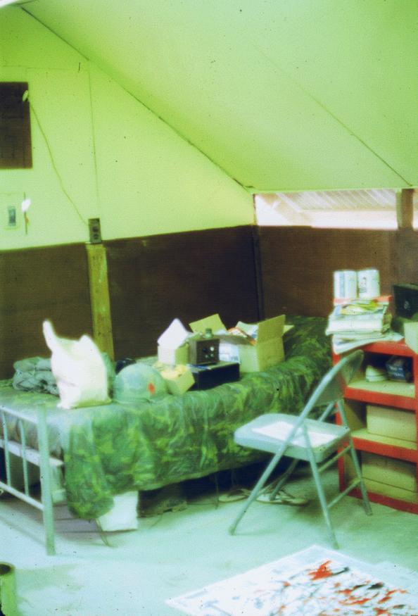 Jim Evans' room adjacent to 1/77 Armored Battalion medical aid station, Quang Tri Combat Base, February 1970. Jim Evans' faux Jackson Pollock painting on floor.