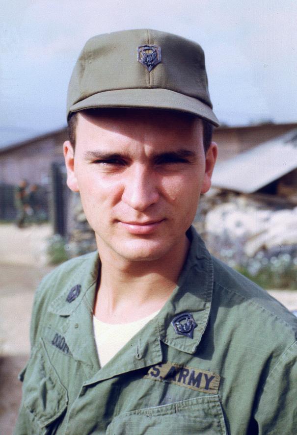 91-C Medical specialist Mark Doom, 1/77 Armored Battalion, 1/5 Infantry Brigade [Mechanized], near entrance to battalion aid station, Quang Tri Combat Base.