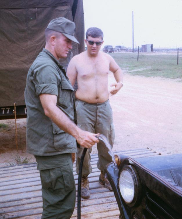 Sgt. Hollis Hobbitts, NCO for 1/77 Armored Battalion medical platoon, with shirt and cap. Medic Zellman in rear. Washing medical platoon vehicle, 1/77 Armored Battalion, 1/5 Infantry Brigade [Mechanized], adjacent to battalion aid station, Quang Tri Combat Base. Quang Tri Province, South Vietnam.