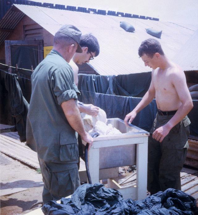 Sgt. Hollis Hibbitts, NCO for 1/77 Armored Battalion medical platoon, with shirt and cap. Medic Arrington Laughlin, behind Sgt. Hibbitts. Medic Hibdon on right. Doing laundry outside battalion aid station, 1/77 Armored Battalion, 1/5 Infantry Brigade [Mechanized], Quang Tri Combat Base, Quang Tri Province, South Vietnam.