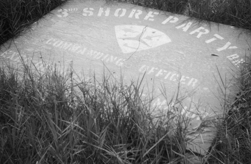 '3rd Shore Party Bn' sign in weeds near 1/77 Armored Battalion, 1/5 Infantry Brigade [Mechanized], Quang Tri Combat Base, Quang Tri Province, South Vietnam.