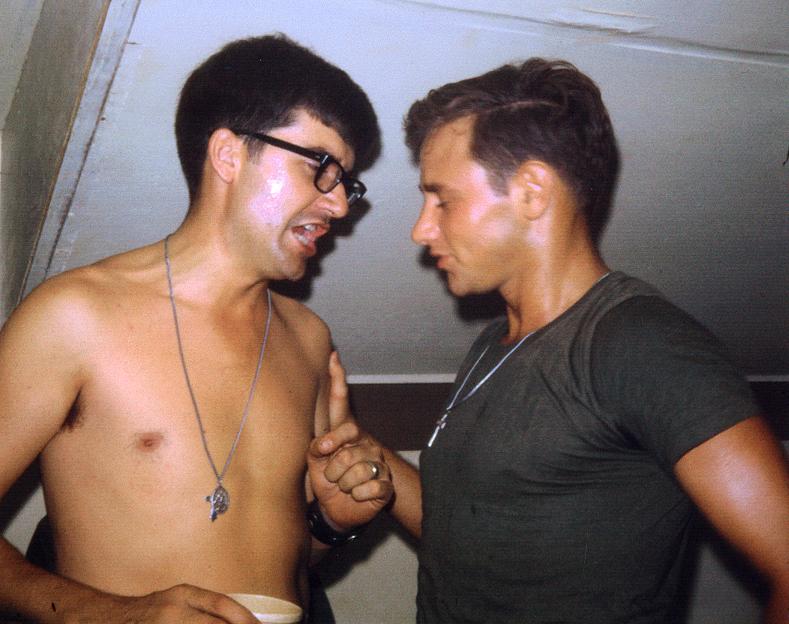 Dr. Barnard, left, and Dr. Tim Stuntz, right on Boys Camp deck, 91st Evacuation Hospital, Chu Lai. Dr. Stuntz, the neurosurgeon at 91st Evacuation Hospital, was also known as 'Scrounge.' If you needed something, he could get it, steaks or booze. Just don't ask where it came from. Don't ask, don't tell.