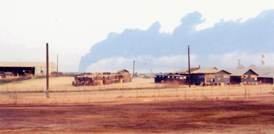 Ammunition dump explosion at Dong Ha, Quang Tri Province, view from Quang Tri Combat Base. At the time the rumor was an enemy rocket caused the explosion. Whatever the cause, the smoke was impressive. Building on left may be motor pool for 1/77 Armored Battalion, 1/5 Infantry Brigade [Mechanized], Quang Tri Combat Base.