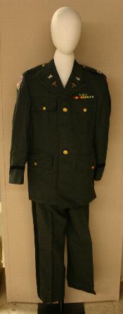 U.S. Army officer Class A uniform trousers and jacket. Jacket has Captain's bars on epaluts, medical corp insignia and U.S. on collar. Jacket has two ribbon bars including Army Commendation Medal, National Defense Service Medal, Vietnam Service Medal and Republic of Vietnam Campaign Medal. Left Shoulder has U.S. Army Staff Support patch, Right shoulder has U.S. Army-Vietnam patch.