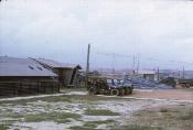 1/77 battalion commander's hootch with gabled door. Building on the left was probably billet for battalion executive officer and chaplain. TOC(tactical operations center) was located in an underground bunker covered by green tarps behind jeeps. 1/77 Armored Battalion theater with white roof is to right of jeeps in distance