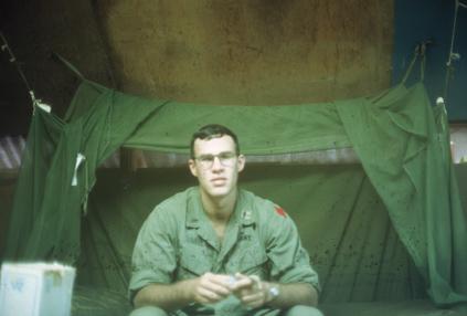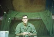 1st Lt. Paul Sauer, Army Medical Service Corps, 1/77 Armored Battalion, 1/5 Infantry Brigade(Mechanized), in hootch by battalion aid station, Quang Tri Combat Base. He served with 1/77 from July 1969 to July 1970. Mosquito net over bed.