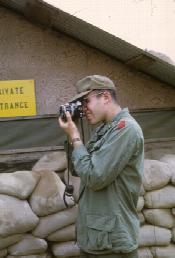 1st Lt. Paul L. Sauer, MSC, with camera, by entrance to hootch for battalion surgeon and Medical Service Corps lieutenant, Quang Tri Combat Base