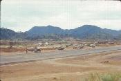 Kham Duc air strip with helicopters parked adjacent to tarmac. View appoximately to north.