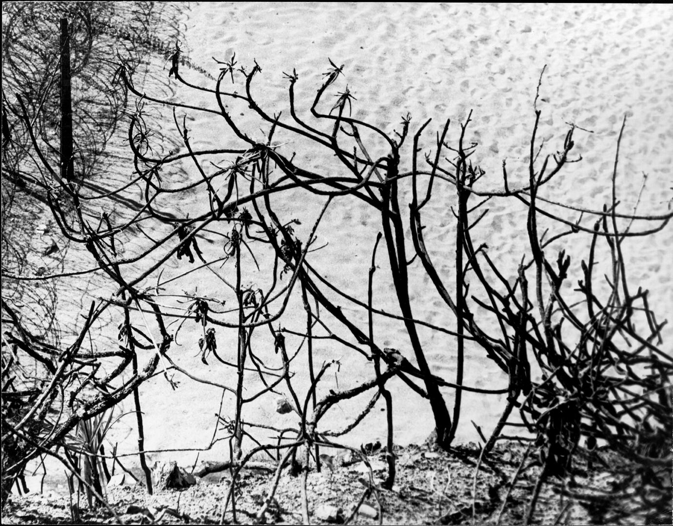 21-21A close-up view of defoliated shrubs below 91st Evacuation Hospital and concertine wire on beach on left.