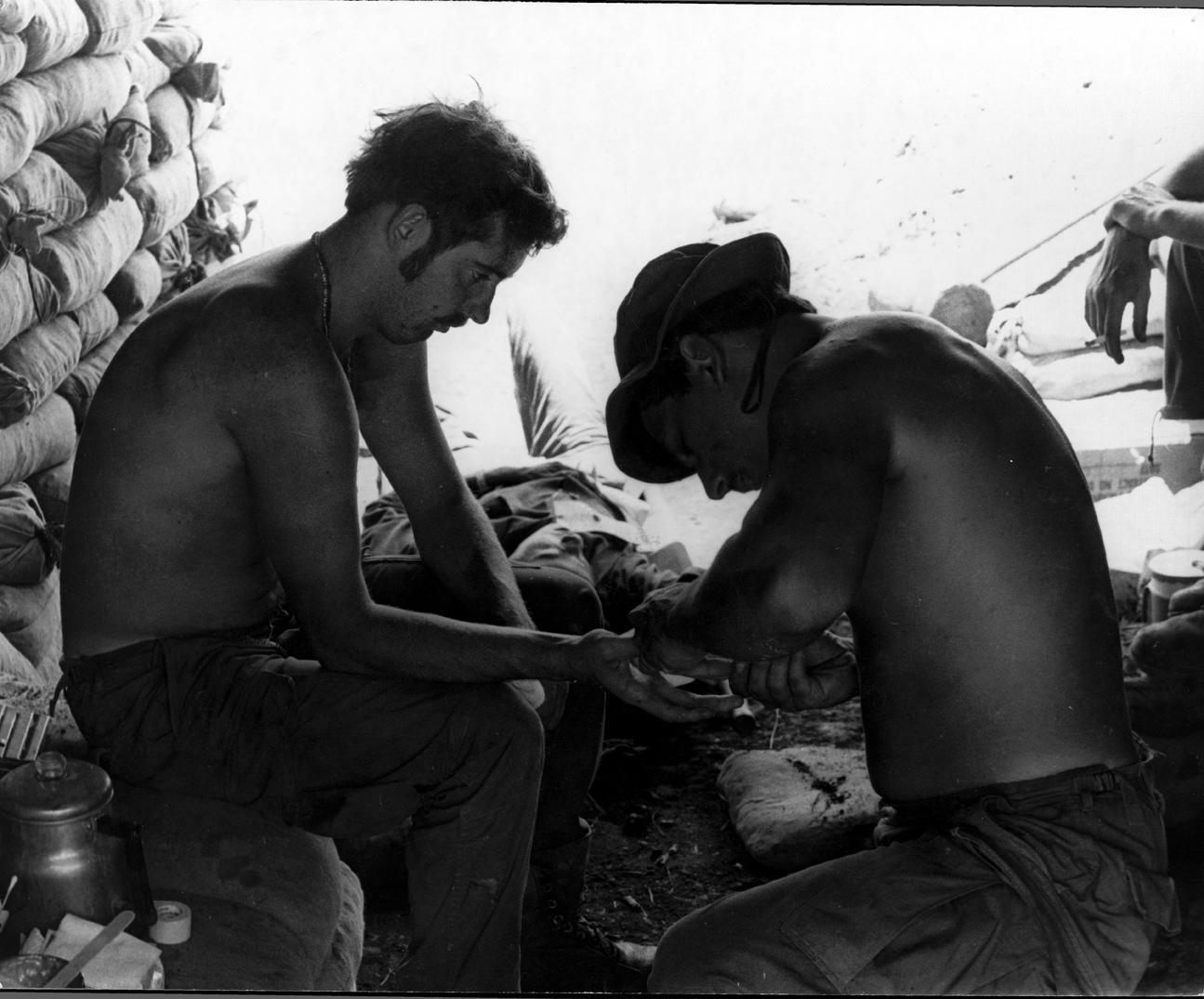 25A or 26A Medic Rocky Bampanni [spelling uncertain] bandaging soldier's finger