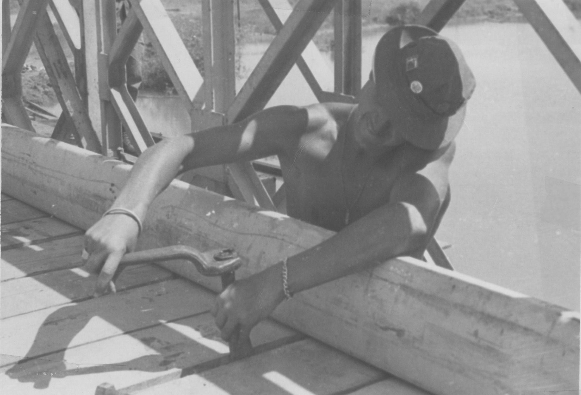 CHU LAI, Vietnam (Americal IO)--Bracing the boards on this bridge, a soldier from the 26th Engineer Battalion, AMerical Division, helps reconstruct worn bridge sections.