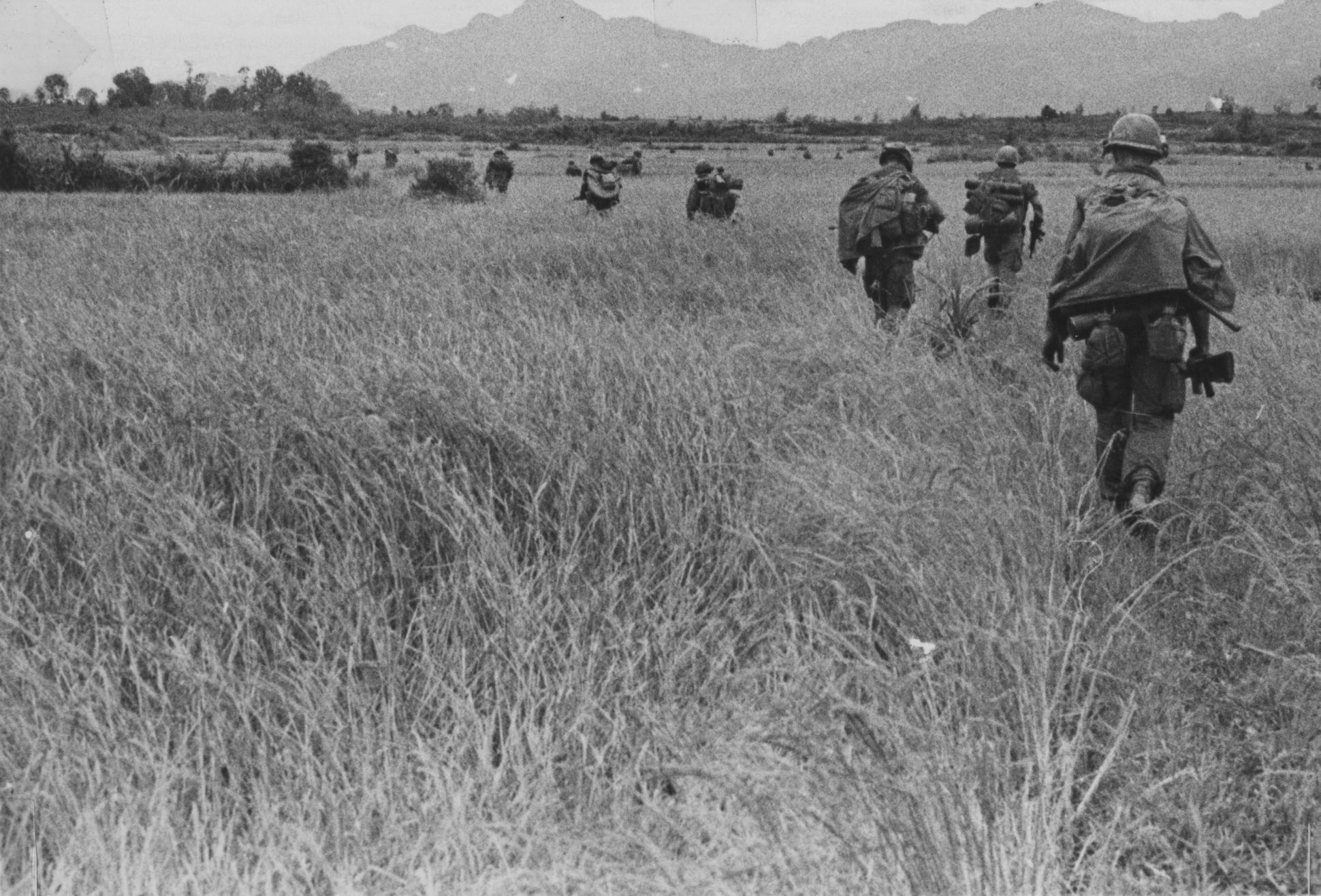 It's walking, walking and more walking for the infantry and Americal troopers of D Co., 1/52 Inf., 198th Bde. are no exception. The unit was on a recent operation 20 miles south of Chu Lai.