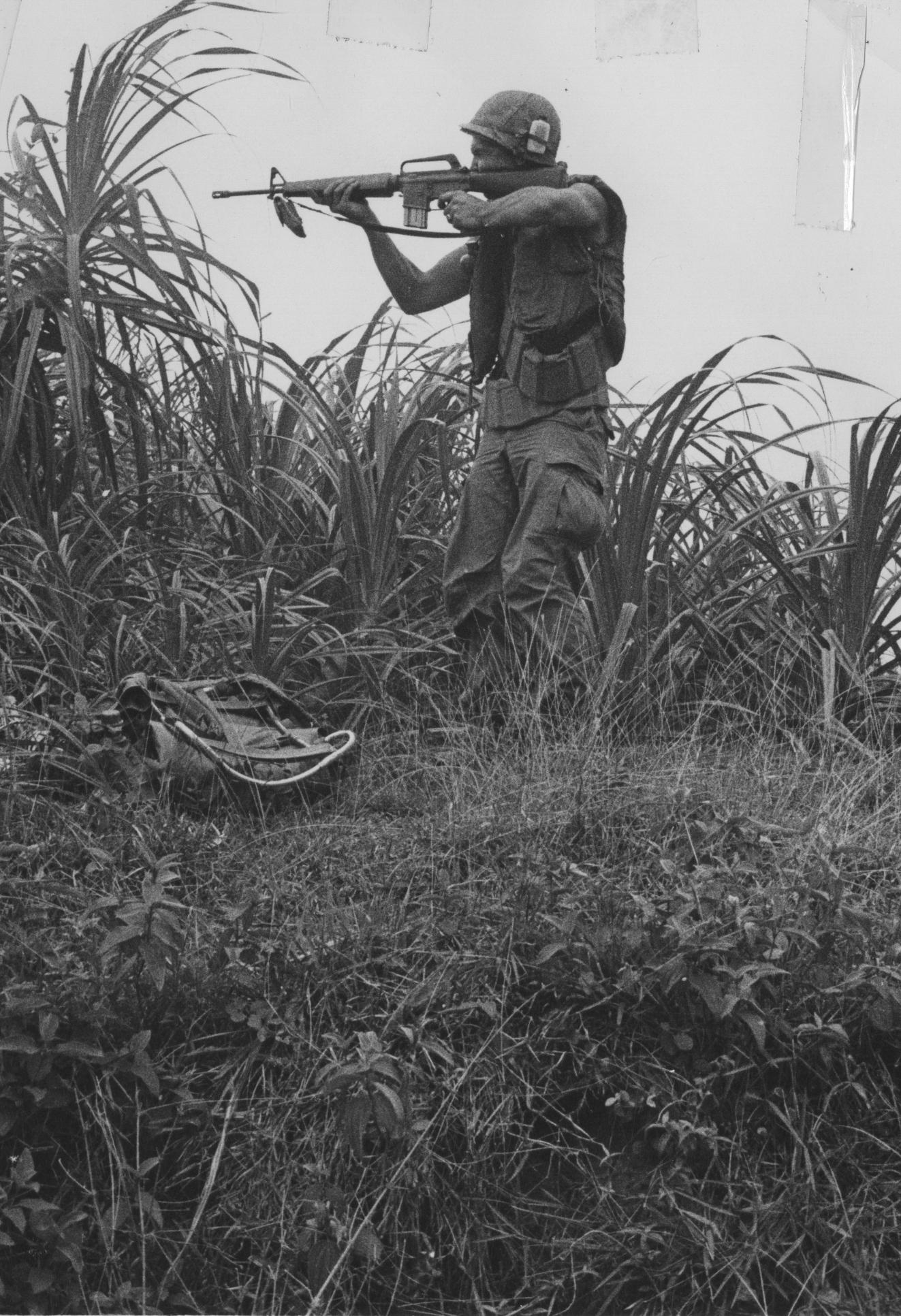 CHU LAI, Vietnam (Americal IO)--An Americal Division soldier or D Co., 1/52 Inf., 198th Bde. returns fire during recent action 20 miles south of Chu Lai.