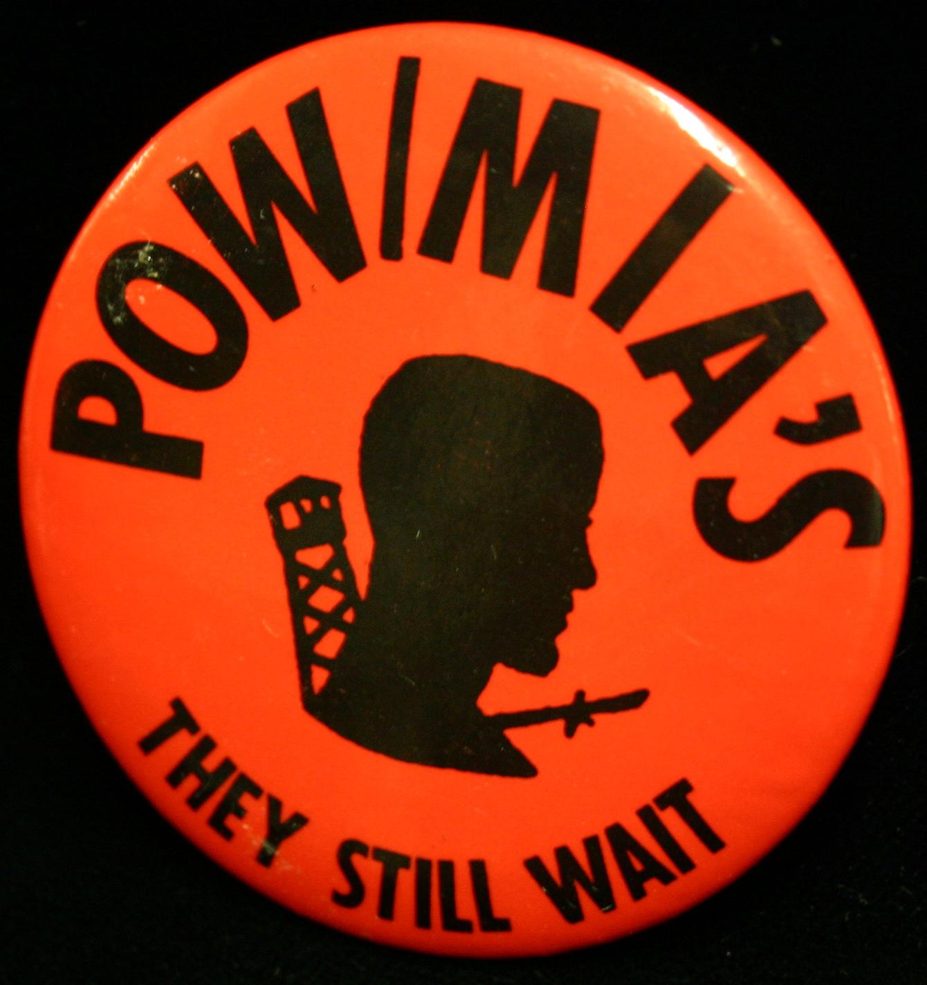 Red button with P.O.W./M.I.A. silhouette in center. Black text surrounding logo: POW/MIA'S, THEY STILL WAIT.